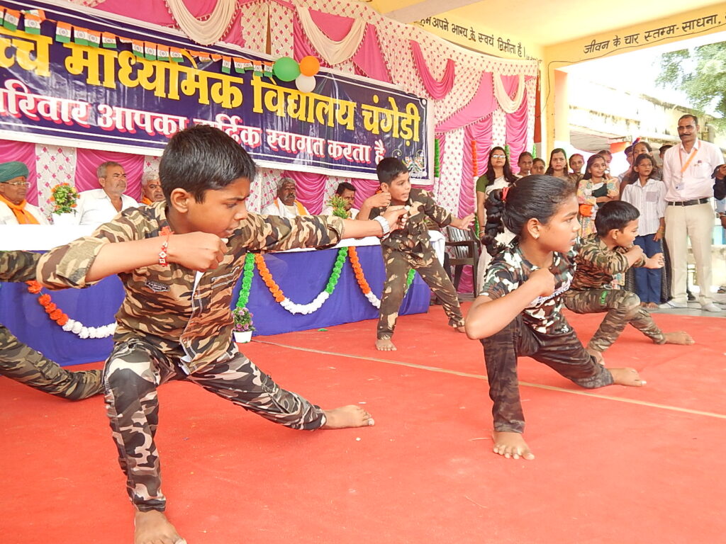 फतहनगर। चंगेड़ी के राजकीय उच्च माध्यमिक विद्यालय में रंगारंग कार्यक्रमों के साथ 79वां स्वतन्त्रता दिवस मनाया गया। संस्था प्रधान मोहनलाल स्वर्णकार द्वारा ध्वजारोहण एवं मार्च पास्ट की सलामी के बाद बालक-बालिकाओं द्वारा प्रस्तुत देशभक्ति से ओतप्रोत कार्यक्रमों ने समां बांध दिया। आॅपरेशन सिंदूर को लेकर प्रस्तुत नाटिका ने भारतीय सेना के शौर्य एवं पराक्रम की याद को ताजा कर दिया। इस नाटिका की जीवंत प्रस्तुति ने समारोह में चार चांद लगा दिए। इसी प्रकार से सोशल मिडिया के दुष्प्रभाव को लेकर भी जोरदार नाटिका का मंचन किया गया। राजस्थानी एवं देशभक्ति से परिपूर्ण एक एक कार्यक्रम को दर्शक अपलक निहारते रहे। प्रत्येक कार्यक्रम पर बच्चों को खूब दाद मिली। संस्था प्रधान स्वर्णकार द्वारा विद्यालय की शैक्षिक,सह शैक्षिक एवं भौतिक उपलब्धियों को पटल पर रखा गया जिससे प्रेरित होकर कई भामाशाहों ने राशि की घोषणाएं की। इन भामाशाहों का मौके पर ही संस्था प्रधान एवं अतिथियों के द्वारा उपरने द्वारा स्वागत किया गया। बोर्ड परीक्षा की प्रतिभावान बालिकाओं को संस्था प्रधान स्वर्णकार,खुशनुमा बानो एवं जगदीशसिंह राव की ओर से नकद राशि प्रदान कर सम्मानित किया गया। समारोह में किशनलाल धोलिया मुख्य अतिथि थे जबकि भगवानलाल जाट,सरपंच श्रीमती सुमित्रा देवी जाट,मोहनलाल जाट,गौत्तमलाल शर्मा,पंचायत समिति सदस्य भोमसिंह चुण्डावत,माधवलाल गाडरी, विधायक प्रतिनिधि हीरालाल जाट,गोवर्धनसिंह रावत आदि बतौर विशिष्ट अतिथि मौजूद थे। किशनलाल धोलिया की ओर से बच्चों को भोज दिया गया। मार्च पास्ट एवं पीटी प्रदर्शन शारीरिक शिक्षक प्रभूलाल रेगर के निर्देशन में किया गया। आभार उप प्रधानाचार्य श्रीमती खुशनुमा बानो ने व्यक्त किया जबकि संचालन जगदीशसिंह राव ने किया।