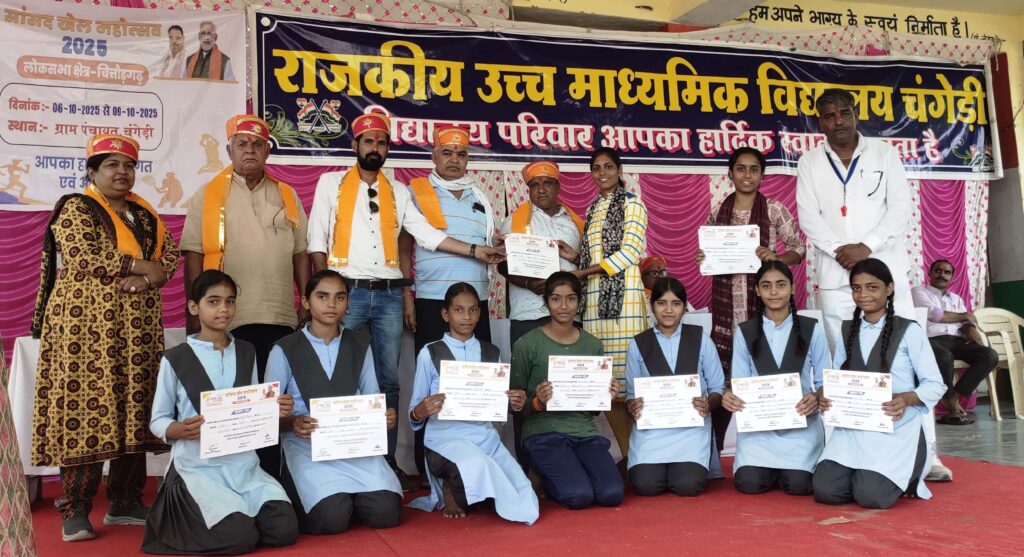 फतहनगर। निकटवर्ती चंगेड़ी में बुधवार को सांसद खेल प्रतियोगिता का आयोजन किया गया। राजकीय उच्च माध्यमिक विद्यालय में आयोजित इस प्रतियोगिता के शुभारंभ समारोह की अध्यक्षता पंचायत प्रारंभिक शिक्षा अधिकारी मोहनलाल स्वर्णकार ने की जबकि मुख्य अतिथि विधानसभा संयोजक रोशनलाल सुथार थे। कार्यक्रम में बतौर अति विशिष्ट अतिथि भाजपा मावली मण्डल अध्यक्ष कैलाश गाडरी, विशिष्ट अतिथि खेल संयोजक नरेश जोशी, खेल प्रभारी मोहनलाल जाट,सह प्रभारी प्रकाश कोठारी, सरपंच प्रतिनिधि भगवतीलाल जाट, फलीचड़ा सरपंच छोगालाल जाट, मण्डल महामंत्री मधुसुदन पारीक,रामलाल गाडरी, ओमप्रकाश द्विवेदी, बद्रीलाल जाट, बालूदास वैष्णव,पंचायत समिति सदस्य भौमसिंह चुण्डावत, मोहनलाल मेघवाल, गणेश प्रजापत, नाथूलाल सेन, अशोक जोशी, गणेश जाट, हेमशकर लौहार आदि उपस्थित रहे। खेल प्रतियोगिताओं का संयोजन व.शा.शिक्षक प्रभुलाल रेगर व दीपक गुसर द्वारा किया गया। इसके अंतर्गत कबड्डी, वाॅलीबाल, रस्सा कस्सी (महिला व पुरुष वर्ग) में खिलाड़ियों ने अपना दमखम दिखाया। शाम 4 बजे तक चली इन प्रतियोगिताओं में विजेता रही टीमों के खिलाड़ियों को समापन अवसर पर मंचासीन अतिथि नरेश जोशी,मोहनलाल जाट,रामलाल गाडरी,प्रकाश कोठारी,गंगाराम टाक,राजकुमार,उप प्रधानाचार्य खुशनुमा बानों एवं माधवलाल गाडरी के हाथों प्रशस्ति पत्र प्रदान कर सम्मानित किया गया। कार्यक्रम का संचालन श्रीमती मधु मण्डोवरा व जगदीशसिंह राव ने किया। ध्वज अवतरण के साथ ही खेल महोत्सव के समापन की घोषणा नरेश जोशी द्वारा की गई।