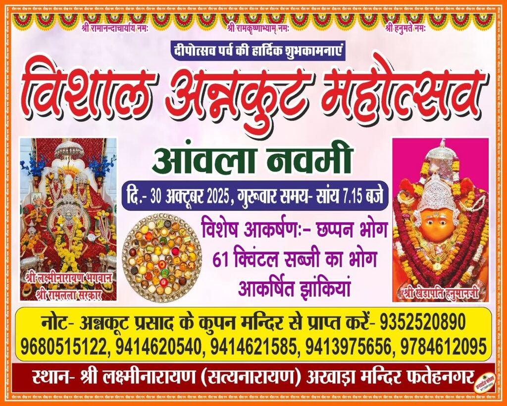 आंवला नवमी पर अखाड़ा मंदिर में होगा 56 भोग : अन्नकूट की श्रृंखला में ही 30 अक्टूबर को आंवला नवमी पर नगर के अखाड़ा मंदिर में छप्पन भोग एवं सब्जी का अन्नकूट वितरण किया जाएगा। नगर के अन्य मंदिरों पर भी आने वाले दिनों में 56 भोग के विशिष्ट आयोजन होंगे।