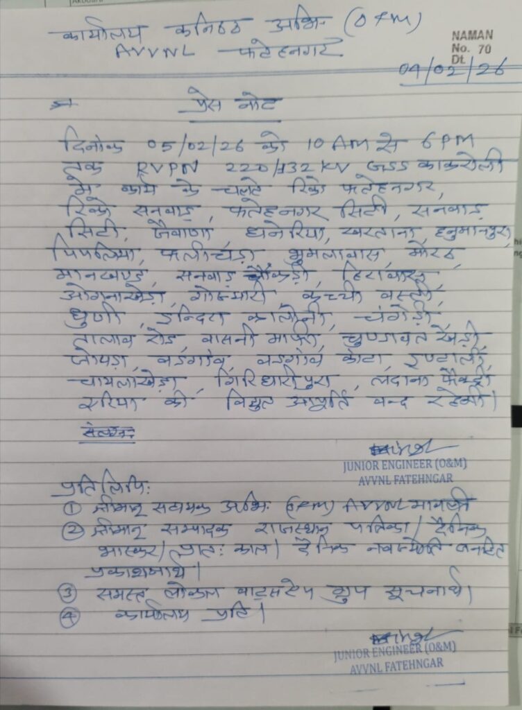 फतहनगर। RVPN 220/132 केवी जीएसएस कांकरोली में कार्य के चलते गुरुवार को फतेहनगर क्षेत्र के इलाकों में विद्युत आपूर्ति प्रातः 10:00 से शाम 6:00 तक बंद रहेगी। अजमेर विद्युत वितरण निगम के कनिष्ठ अभियंता के अनुसार फतहनगर के रीको फतेहनगर, रीको सनवाड़, फतहनगर सिटी सनवाड सिटी, जेवाणा, खरताणा, धनेरिया, हनुमानपुरा, पिपलिया,फलीचड़ा,भूमलावास,मोरठ,मानखंड,सनवाड़ चौकड़ी, हीरावास, ओगना खेड़ा, गौज्यारी, कच्ची बस्ती,धुणी,इंदिरा कॉलोनी,चंगेड़ी,तालाब रोड़,वासनी माफी,चुण्डावत खेड़ी, जोयड़ा, बड़गाँव,बड़गाँव कांटा, ईंटाली, चांयला खेड़ा,गिरधारीपुरा, लदाना फैक्ट्री सीमा की आपूर्ति बंद रहेगी।