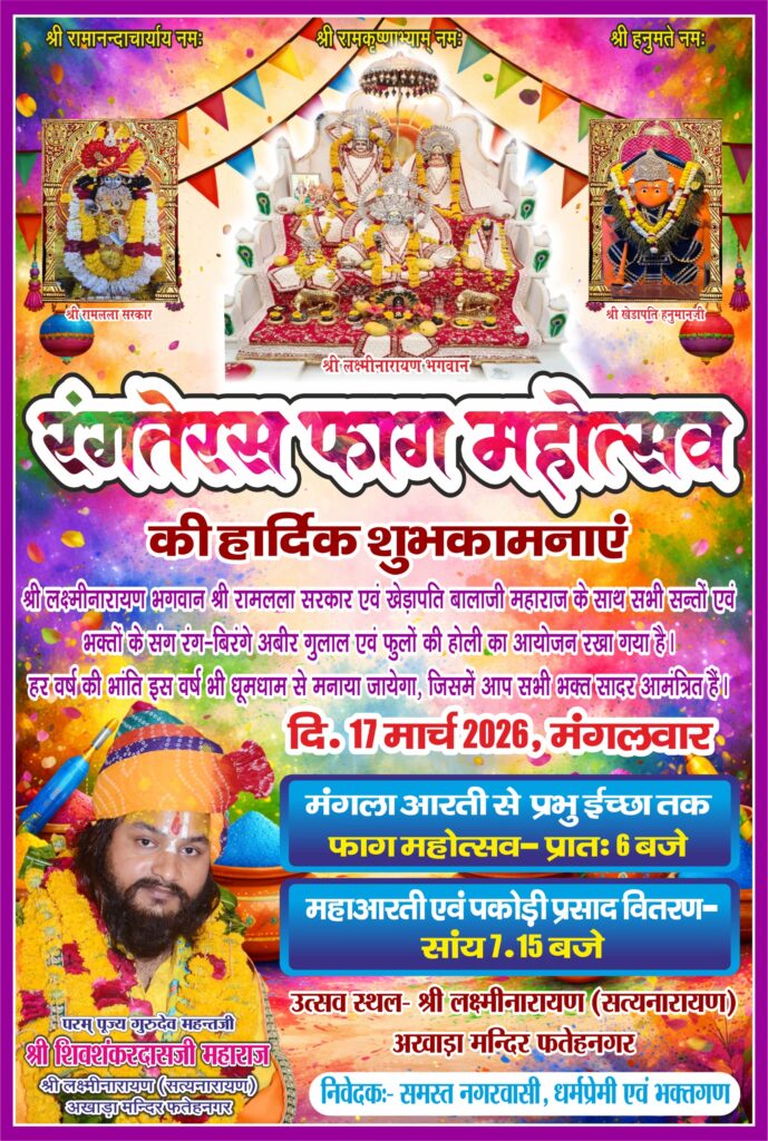 फतहनगर। फाग महोत्सव के क्रम में शनिवार शाम 7:15 बजे फतहनगर द्वारकाधीश मंदिर के सामने बालाजी महाराज के मंदिर में महा आरती एवं फाग उत्सव का आयोजन किया जाएगा। इसी प्रकार से 17 मार्च मंगलवार को नगर के अखाड़ा मंदिर पर फाग महोत्सव के तहत भगवान लक्ष्मी नारायण भक्तों के संग गुलाल अबीर से होली खेलेंगे। सायं 7:15 बजे महा आरती एवं पकौड़ी वितरण होगा।