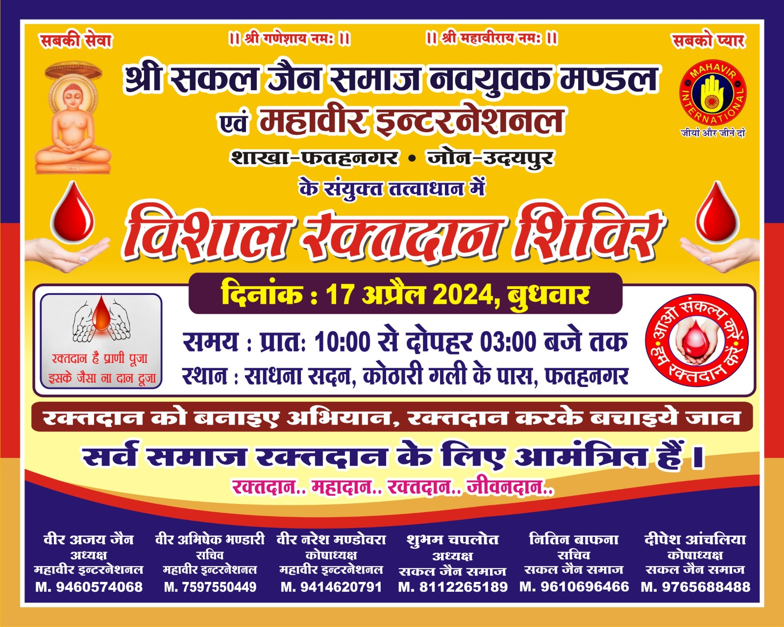 फतहनगर। समाजसेवा में लगातार अग्रणी स्थानीय महावीर इंटरनेशनल शाखा फतहनगर एवं सकल जैन समाज नवयुवक मंडल फतहनगर के संयुक्त तत्वावधान में बुधवार को विशाल रक्तदान शिविर का आयोजन साधना सदन, फतहनगर में किया जाएगा। कार्यक्रम में सर्वसमाज के रक्तदान करने वाले युवाओं को आमन्त्रित किया गया है। रक्तदान कार्यक्रम प्रातः 09 बजे से 03.30 बजे तक चलेगा। शाखा के अध्यक्ष अजय जैन द्वारा दी गयी जानकारी के अनुसार रक्तदान के दौरान रक्तदाता की बी.पी., ब्लडग्रुप आदि जाँच की जावेगी। रक्तदान से पहले जूस व बाद में अल्पाहार करवा प्रशस्ति पत्र व उपहार भेंट किया जावेगा।