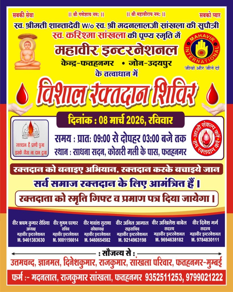 फतहनगर। महावीर इंटरनेशनल फतहनगर शाखा के तत्वावधान में रविवार को सांखला परिवार द्वारा स्वर्गीय करिश्मा सांखला की पुण्य स्मृति में रक्तदान शिविर का आयोजन किया जाएगा।