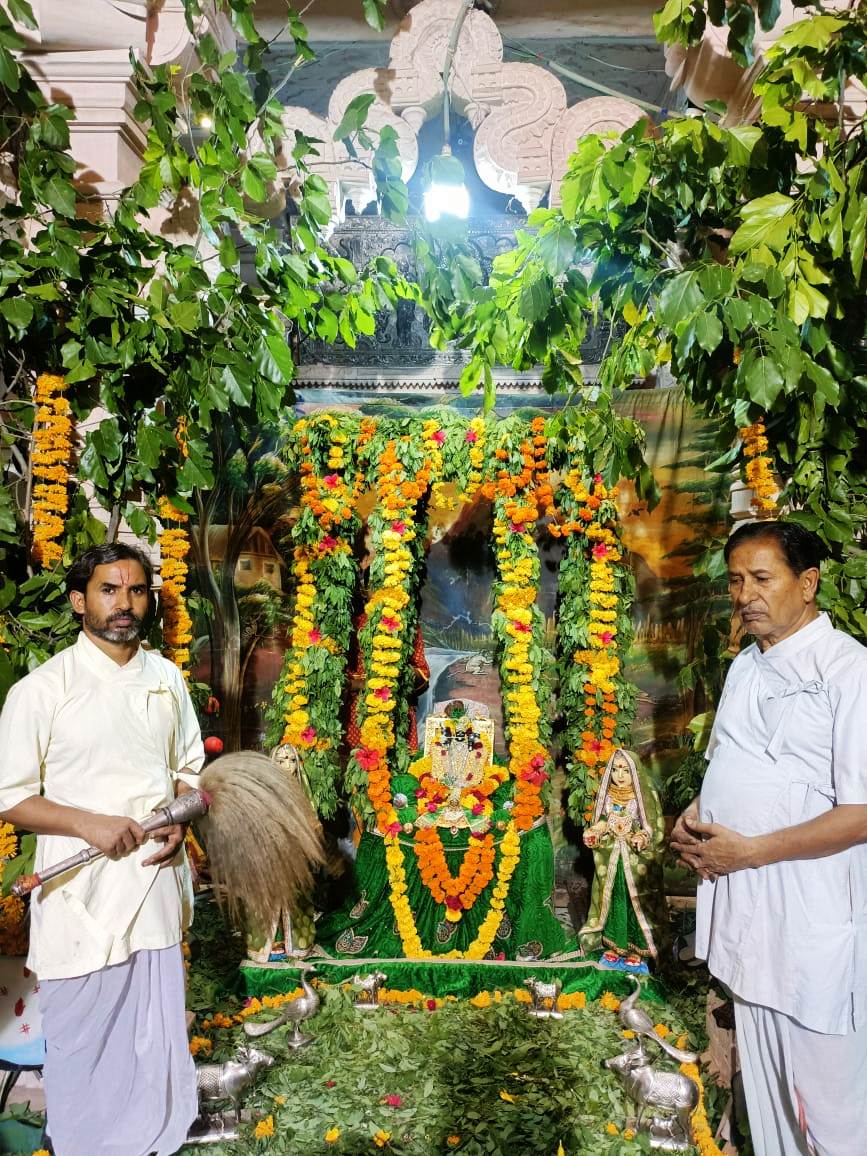 फतहनगर। यहां के द्वारिकाधीश मंदिर में सोमवार को हरियाली अमावस्या पर हरियाले हिण्डोलने का मनोरथ किया गया। मनोरथ का आयोजन एकादशी से ही शुरू हो गया था। आज हरियाली अमावस्या होने से ठाकुरजी को नवनीत प्रियाजी के संग फूल पत्तियों से बनाए गए मनमोहक हिण्डोलने में विराजित किया गया। आज दिनभर इस विशेष मनोरथ को लेकर मंदिर में भक्तों द्वारा तैयारी की गई। मंदिर के गर्भगृह के सामने ही आयोजित इस मनोरथ के तहत ठाकुरजी को स्वर्णाभूषण धराए गए। गुलाब के पुष्पों के बीच विराजित ठाकुरजी एवं नवनीत प्रियाजी का मनमोहक श्रृंगार किया गया। ठाकुरजी के मुख पर बांसुरी,हाथों में शंख,चक्र एवं गदा तथा सिर पर स्वर्ण मुकुट धराया गया। ठीक इसके सामने ही मंदिर परिसर में गौ चारण का दृश्य भी दर्शाया गया। शाम सवा सात बजे श्रद्धालुओं के दर्शनार्थ मंदिर के कपाट खोले गए। कीर्तनकारों द्वारा साज बाज के साथ कीर्तन किया गया। महिला मण्डल ने भी गीत गंुजन के साथ इस विशिष्ट आयोजन को उंचाईयां दी। दर्शन खोले जाने के साथ ही भक्तों की आवाजाही बनी रही तथा प्रभुश्री के शयन तक लोग अनवरत आते रहे। मंदिर के पुजारी सत्यनारायण पालीवाल एवं कमल नयन पालीवाल ने ठाकुरजी को चंवर ढुलाकर सेवा अर्पित की। महा आरती एवं प्रसाद वितरण किया गया। मंदिर में चल रहा यह मनोरथ कजली तीज को सम्पन्न होगा।
