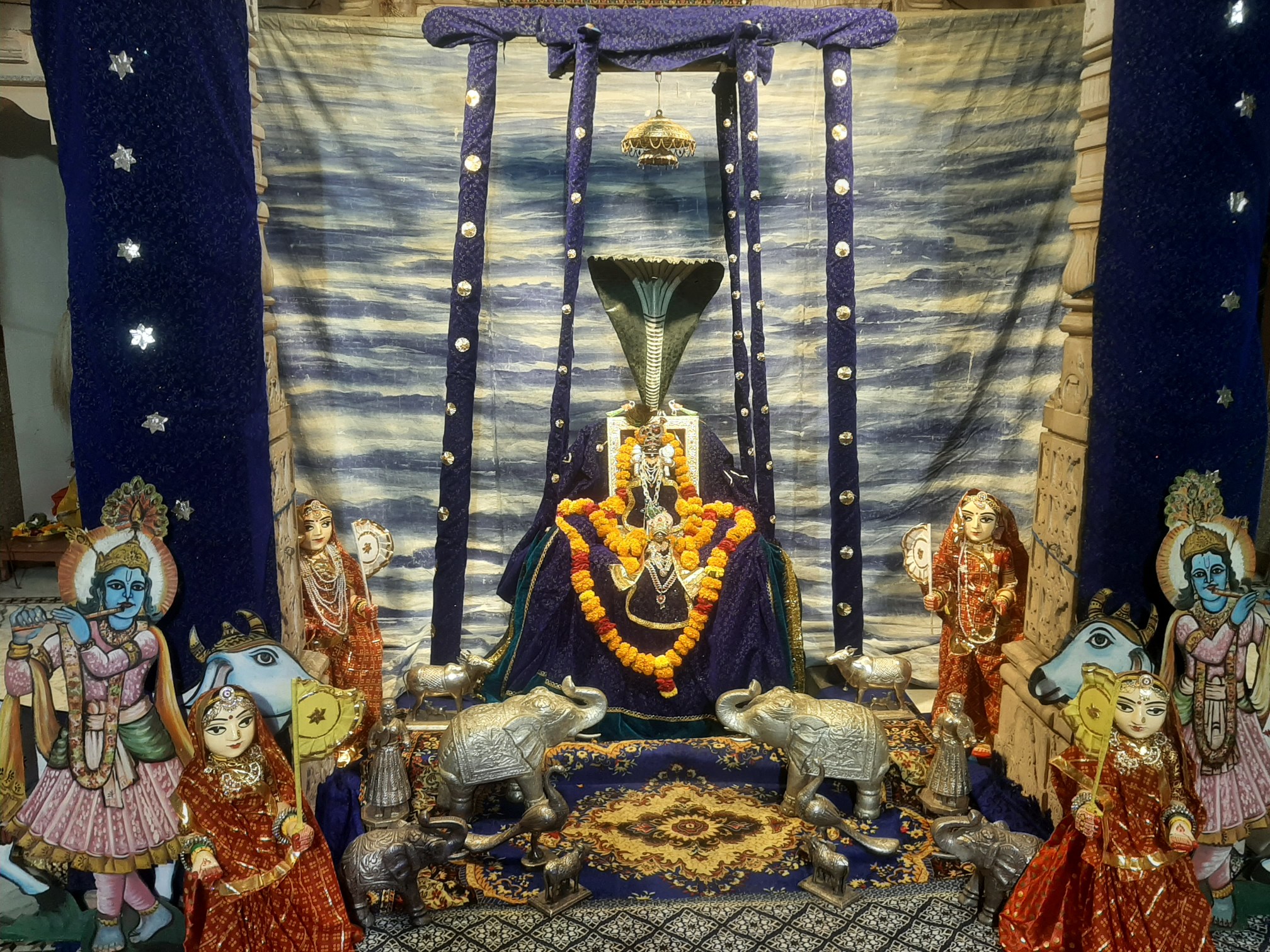 फतहनगर । नगर के द्वारिकाधीश मंदिर में श्रावण मास के तहत चल रहे हिंडोलना मनोरथ के क्रम में मंगलवार को नागपंचमी के अवसर पर मनोहारी हिंडोलना का आयोजन किया गया। मंदिरके गर्भ गृह के सामने आसमानी पिछवई में सज्जित हिंडोलने में ठाकुरजी को नवनीत प्रिया जी के संग विराजित कर नाग के फन की छाया में सज्जित किया गया। आज के इस विशिष्ट मनोरथ के दर्शनार्थ श्रद्धालु मंदिर के कपाट खुलने के साथ ही आते रहे। प्रभु श्री के शयन तक मंदिर में लोगों का आना जारी रहा । मंदिर पुजारी सत्यनारायण पालीवाल एवं कमलनयन पालीवाल ने सेवा अर्पित की ।