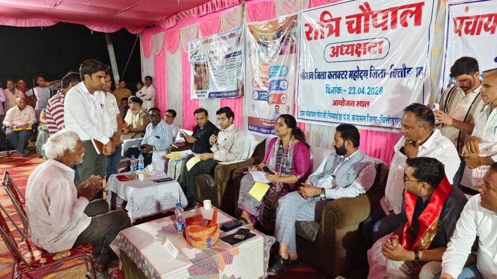 चित्तौड़गढ़, 24 अप्रैल। कपासन पंचायत समिति की निंबाहेड़ा ग्राम पंचायत में गुरुवार रात्रि को आयोजित रात्रि चौपाल में क्षेत्रीय विधायक अर्जुन लाल जीनगर एवं जिला कलक्टर डॉ. मंजू ने आमजन की समस्याएं सुनते हुए संबंधित अधिकारियों को मौके पर ही त्वरित निस्तारण के निर्देश दिए। चौपाल में बड़ी संख्या में ग्रामीणजन उपस्थित रहे और विभिन्न समस्याओं से अवगत कराया।
